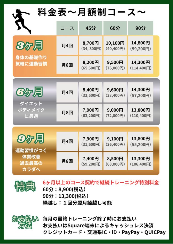45分、60分、90分と月額制で月4回〜8回通えるコースをご用意しております。長く運動習慣がついてくるほどお得な料金設定になっていきます。都度払いや回数券も可能になりますので体験トレーニングの際にお客様に合ったトレーニング頻度プランをご提案させていただきます。